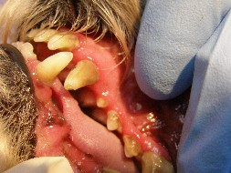 11 year old poodle maltese cross. The teeth were vet cleaned a year ago but without being brushed, the calculus builds up fairly rapidly. At this point the gums were too infected to safely clean the teeth and Oxyfresh Gel was applied twice a day for two weeks.